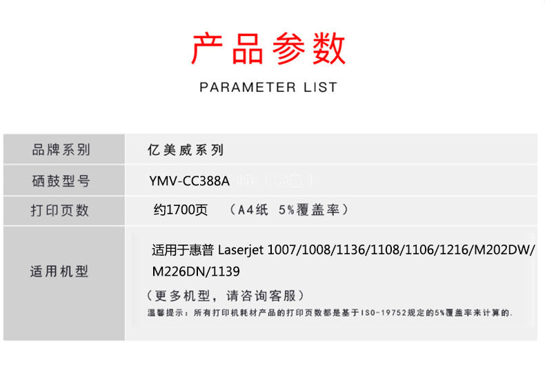 億美威 YMV-CC388A 惠普 Laserjet 1007/1008/1136/1108/1106/1216 全國統(tǒng)一價:178元